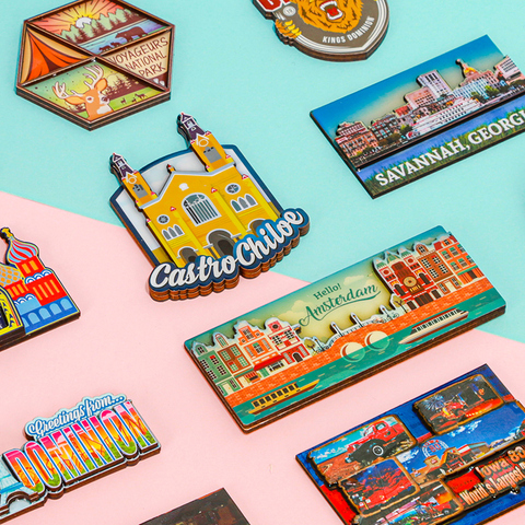 Colección de imanes de Turismo de recuerdo personalizado, imanes de Ciudad de Madera, imán de nevera MDF Vintage con 2/3 capas